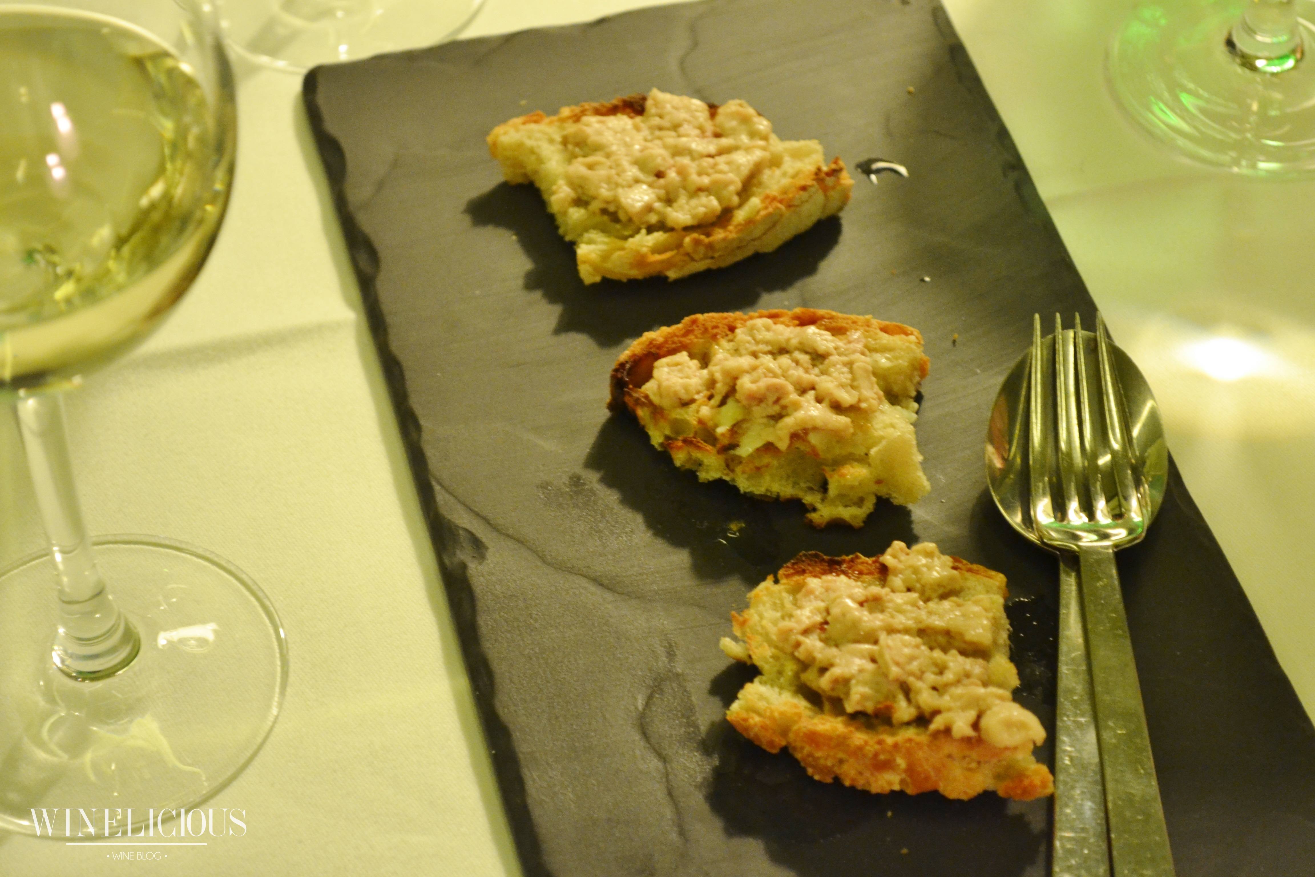 Entradas – tostinhas com foie gras de bacalhau, açorda de bacalhau com pimentos coloridos e ovo de cordoniz e broa de milho aos três queijos (ovelha, cabra e vaca) com compota de Touriga Nacional