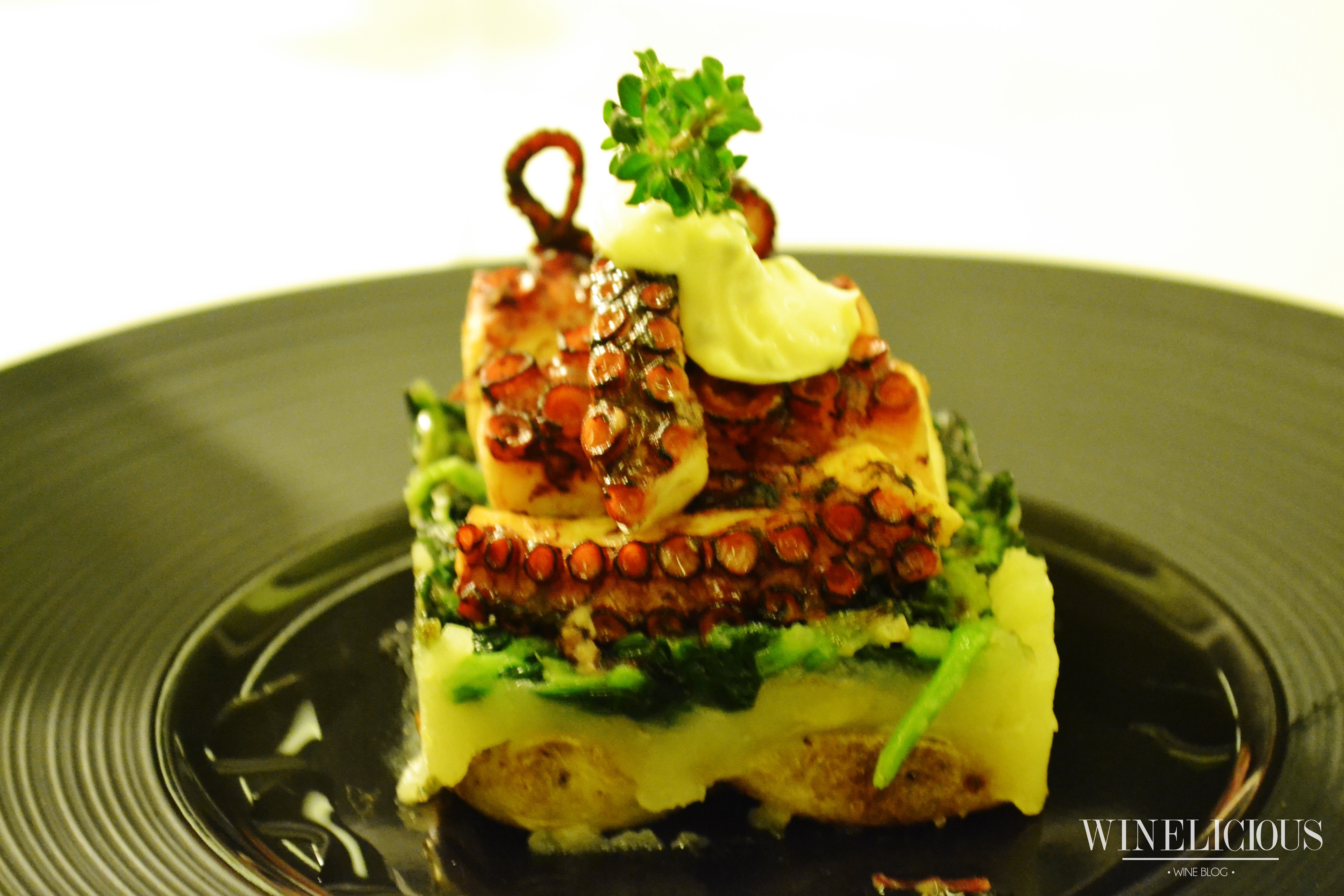 Prato Principal – Polvo assado no forno com orégãos sobre batata a murro, grelos salteados e maionese de alho