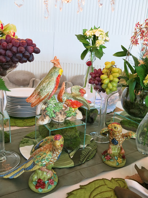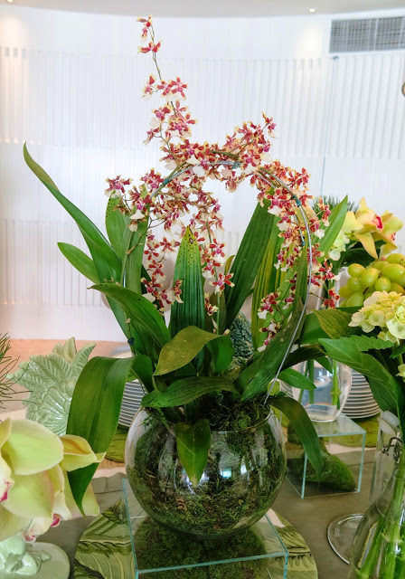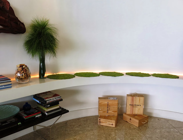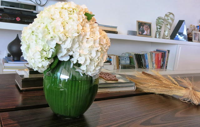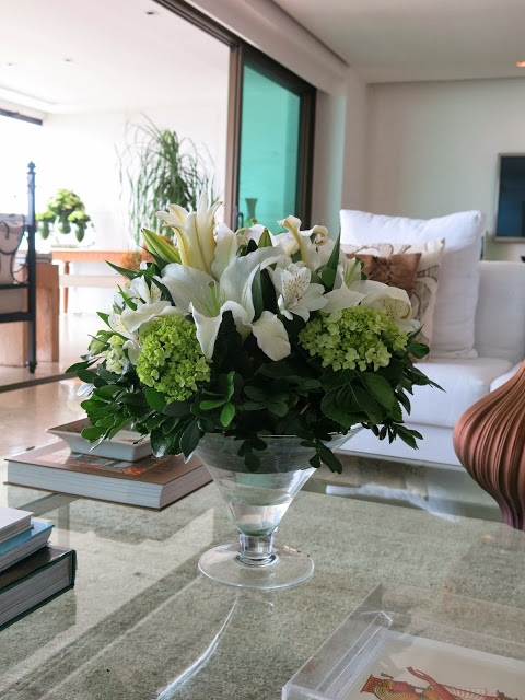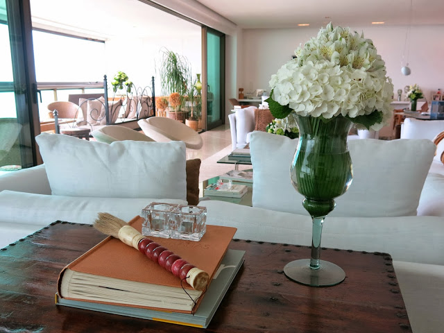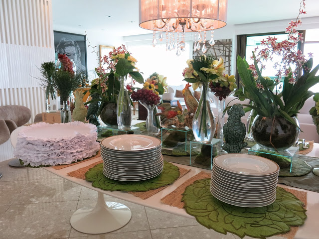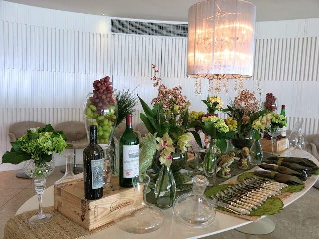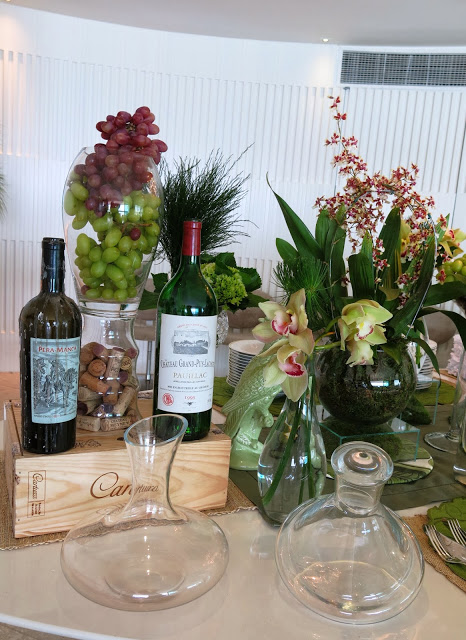 Os anfitriões optaram pelo serviço a americana e por servir o almoço no aparador, deixando o protagonismo da produção para a mesa de jantar que ganhou todos os holofotes. Decorada com flores naturais – especialmente orquídeas e hortênsias -, uvas, decanters, garrafas e caixas a decoração atraiu olhares e ganhou elogios.